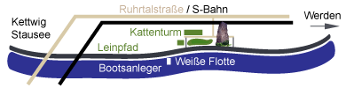• Wir sind ganz einfach zu finden. Fahren Sie von Kettwig kommend Richtung Werden bzw. umgekehrt auf der „Ruhrtalstraße” parallel zur Ruhr. Kurz vor dem Ortseingang zu Kettwig biegen Sie von Kettwig kommend rechts ab bzw. von Werden kommend links ab. Neben der Zufahrtsstraße befindet sich eine Bushaltestelle der Linie 190 Kettwig-Werden (Fußweg 1 Minute). Mit dieser Busverbindung können Sie bequem ohne eigenen Pkw zu uns gelangen.